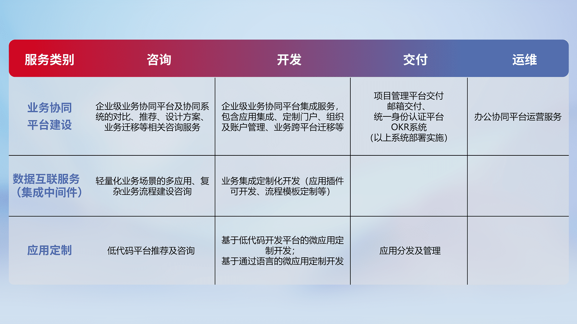针对钉钉、、、、企微、、IDaas等平台级产品提供产品的规划、、、方案、、交付、、定制化开发等服务,,,,实现如统一协同办公、、、智能客户服务、、、、混合会议管理、、、、智能数据查询、、、等业务场景,,实现数字化转型。。。。