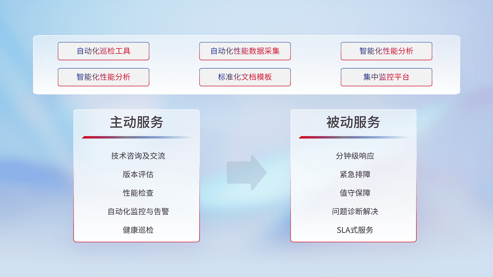智能化工具和标准化文档,,,,保障服务质量,,,提供主动服务(包含技术咨询、、、版本评估、、、性能检查、、、、自动化监控与告警、、、健康巡检)和被动服务包含(分钟级响应、、、、紧急排障、、、、值守保障、、、、问题诊断解决、、、SLA服务)。。。。